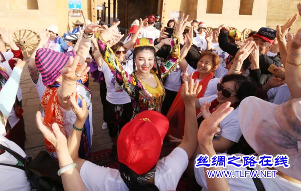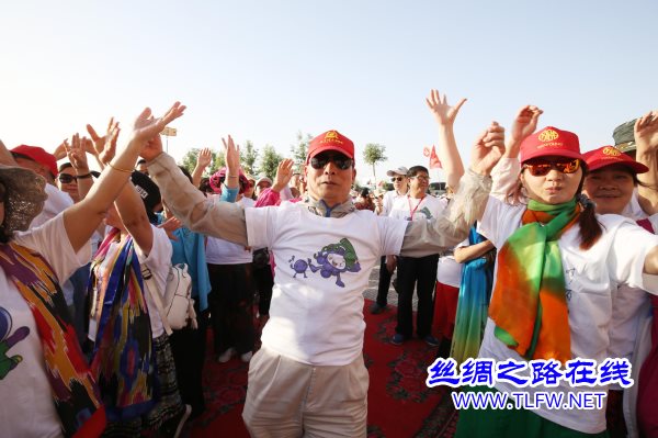 湖南游客和吐鲁番景区工作人员在一起跳舞,庆祝首列专列抵达吐鲁番
