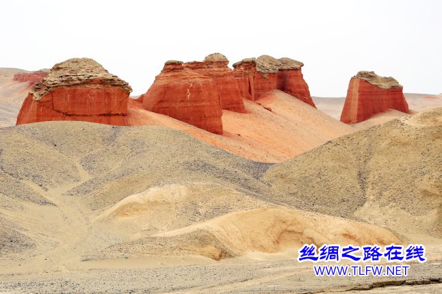 因受风力的作用,单个山体顶端似童话小说里面的城堡顶一样,多个组合起来就像是一座巍峨的“红色城堡”。“红色城堡”周边的很多红色山体也是奇形怪状,有的像“城墙”、有的像“碉堡”、“烽火台”等。