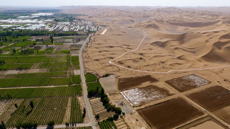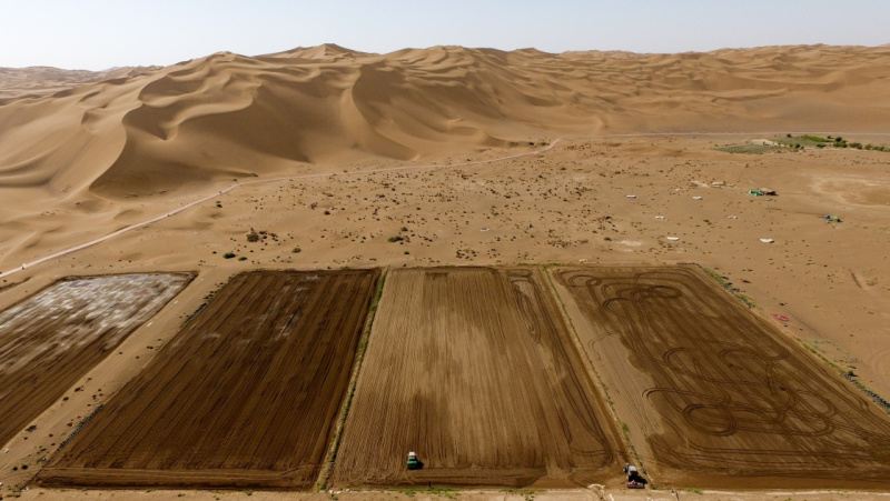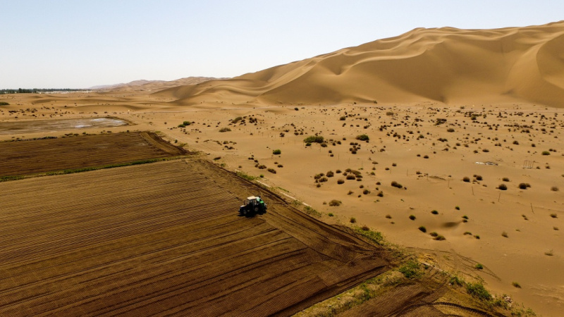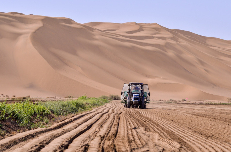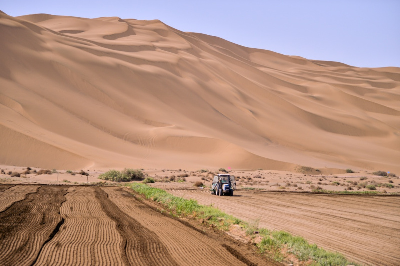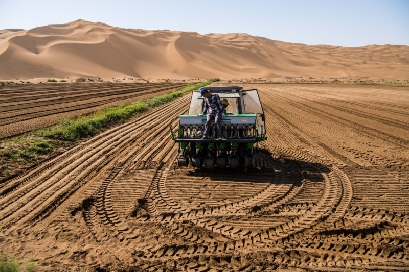 当日,在位于新疆库木塔格沙漠边的鄯善县辟展乡,从东北引进的新型旱稻品种正在开播。据稻种研发人彭国威介绍,这种旱稻适应性强,采用旱田直播技术,结合新疆当地沙漠地区纯净的沙土和特殊的气候,可产出优质绿色的有机大米。