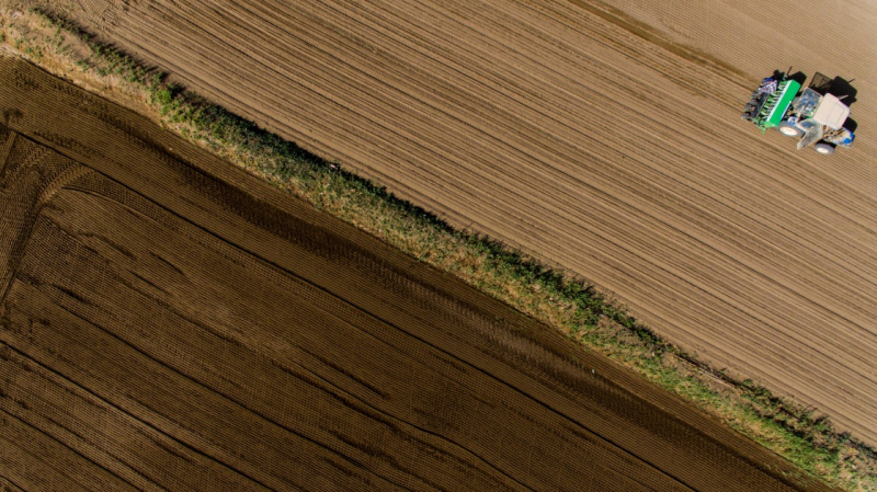 5月5日,播种机在库木塔格沙漠边的稻田播种。